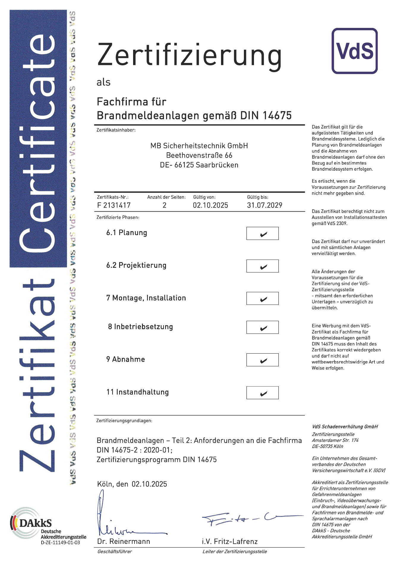 • VdS Fachfirma für Brandmeldeanlagen gemäß DIN 14675
