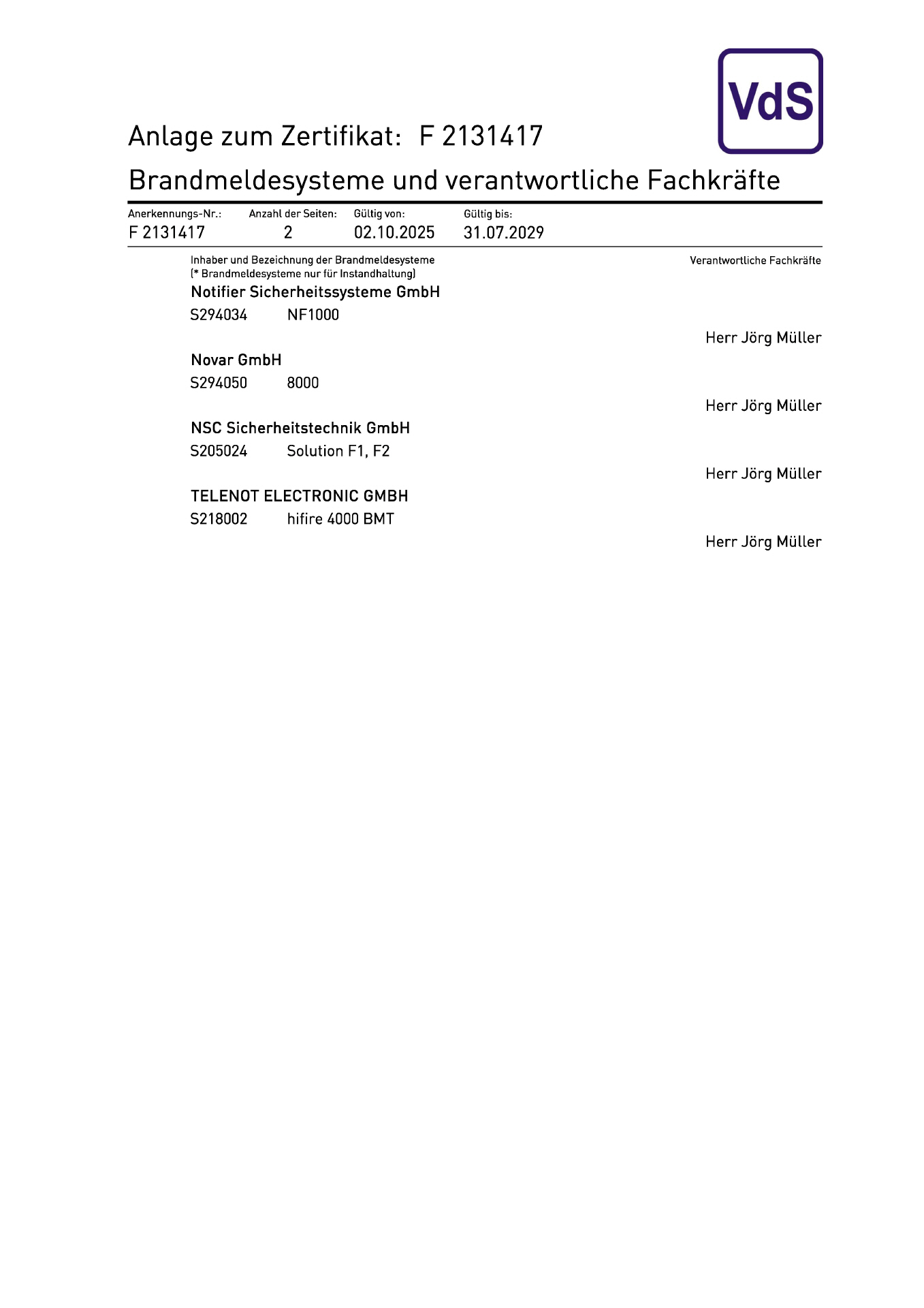 • Verantwortliche Fachkraft für Einbruchmeldeanlagen VdS (Jörg Müller)
